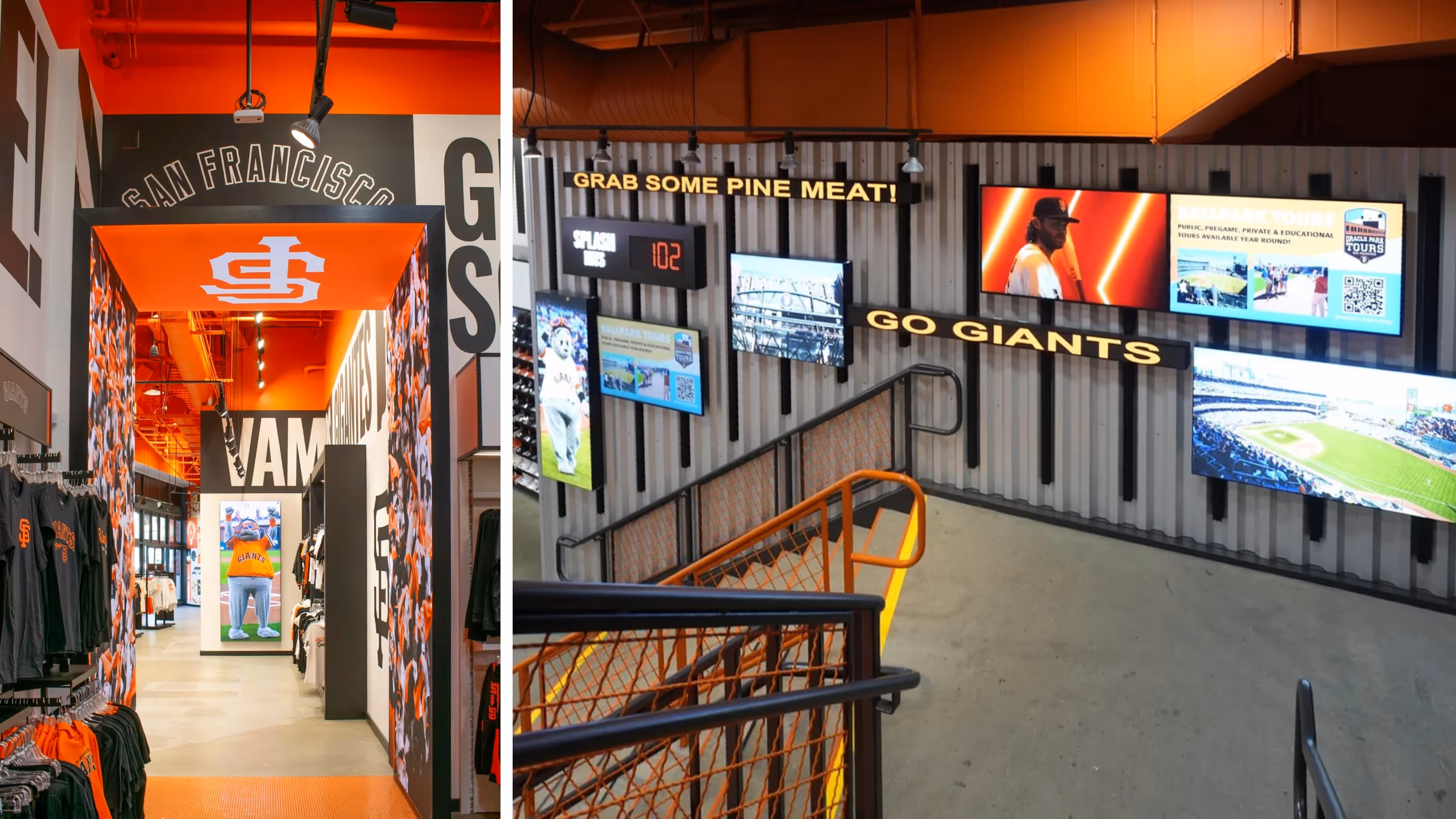 The aim was to make the space feel authentic to the Giants community without getting in the way of how people moved. Rather than pulling attention to screens or moments that would stop the flow on gamedays, we used lighter cues that kept fans connected to the game as they passed through. That included live radio broadcasts, call-outs to iconic moments, in-bowl soundFX, and a live splash hit counter.