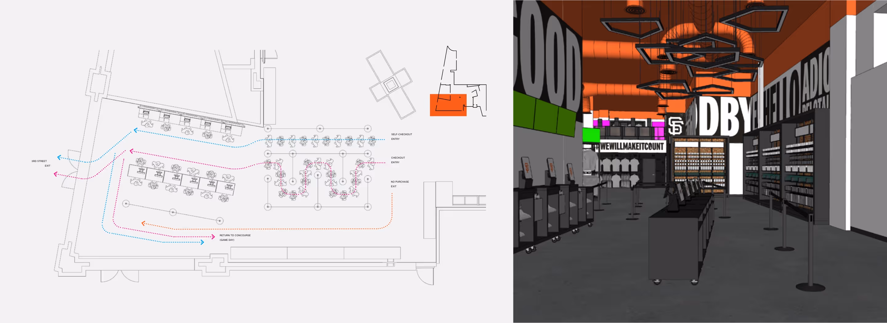 This wasn’t a blank-sheet redesign. The footprint was fixed, the upcoming MLB season meant hard deadlines, and crowd volumes ranged from quiet weekday mornings to full gameday surges. On gamedays, the store wasn’t just retail. It became part of the stadium’s ingress infrastructure.