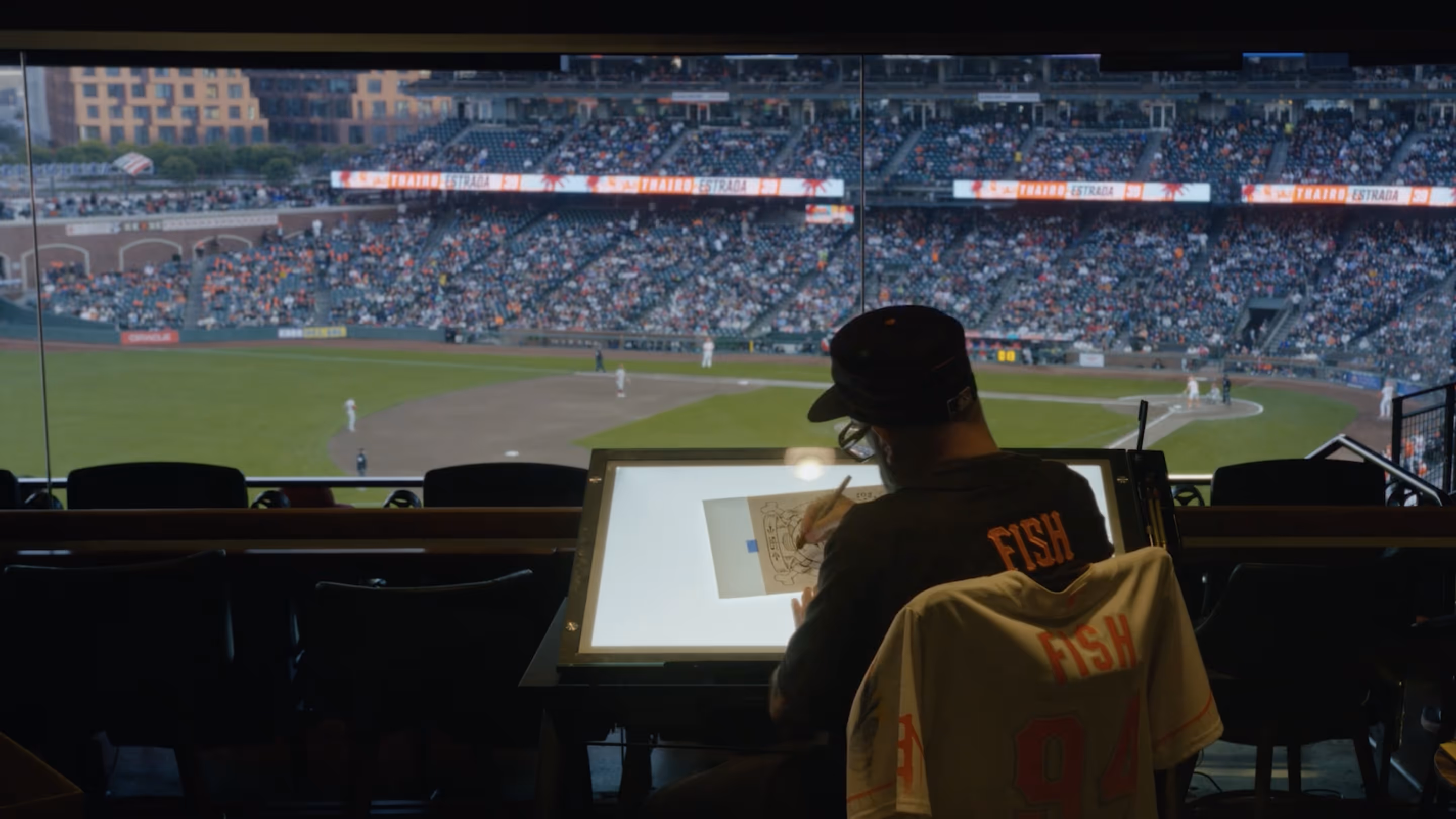The idea was to convert part of the club into a working studio and invite San Francisco artist Jeremy Fish, with whom we’d recently collaborated and who had a strong following among the local fanbase, to create new work live during games. Over the course of 19 home games, the work would build night by night, responding to each game as it happened. The club wouldn’t host a finished exhibition — it would become a record of that stretch of the season as it unfolded.
